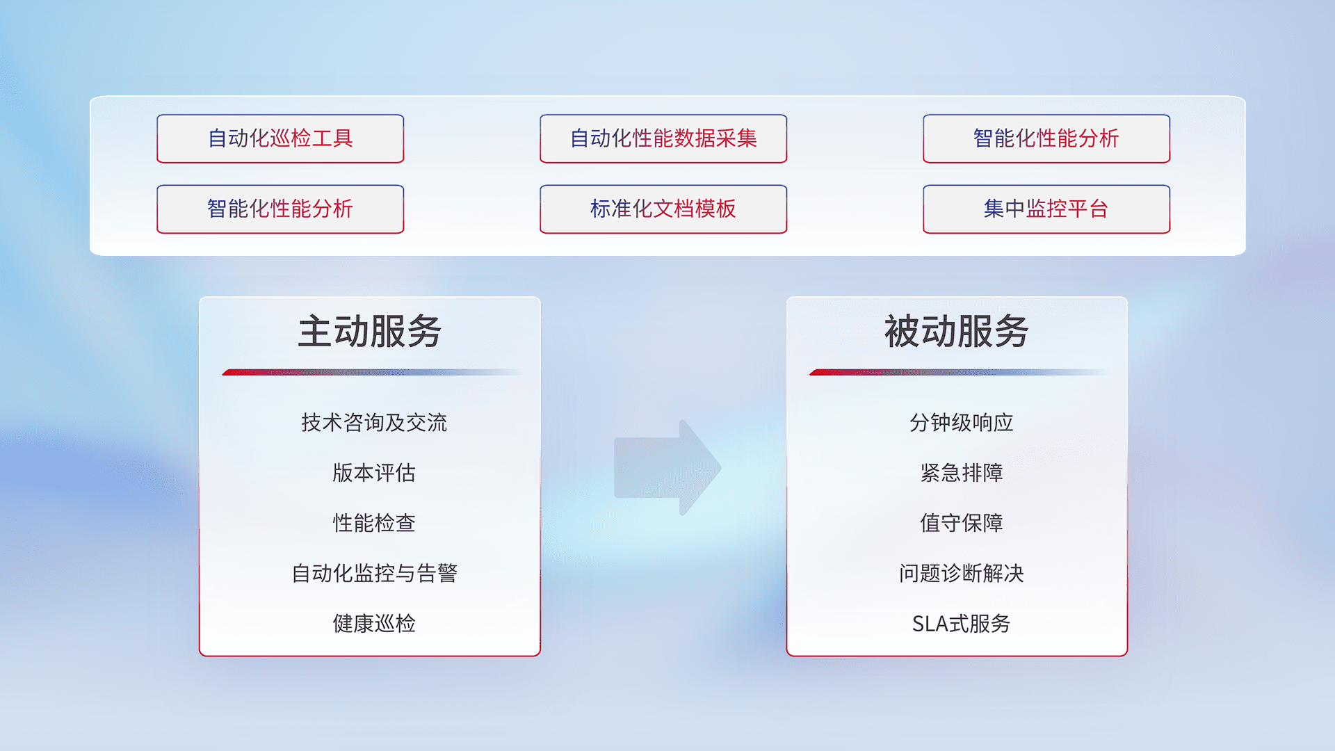 智能化工具和标准化文档,,,,保障服务质量,,,提供主动服务(包含技术咨询、、、、版本评估、、、性能检查、、自动化监控与告警、、、、健康巡检)和被动服务包含(分钟级响应、、、紧急排障、、值守保障、、、、问题诊断解决、、、SLA服务)。。。。